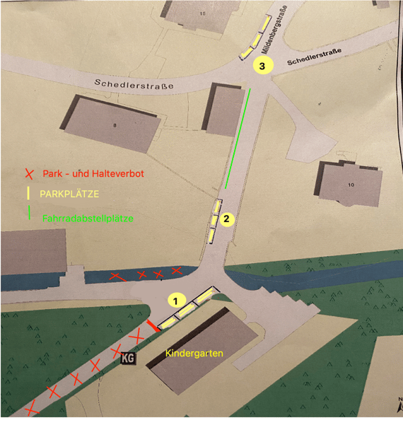 wir bitten euch, eure Autos ausschließlich in den vorgesehenen Bereichen 1, 2 und 3 zu parken. Bitte parkt eure Autos keinesfalls hinter den Parkverbotsschildern und auf